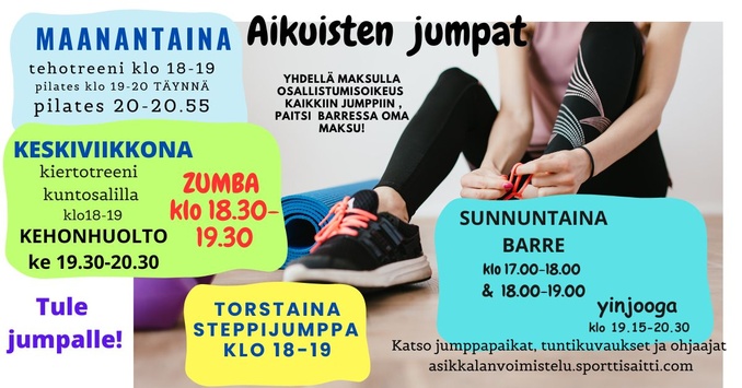 KEVÄTKAUDELLE ei tarvitse ilmoittautua uudestaan. Jos olet UUSI JUMPPARI ja haluat mukaan, niin sinun pitää ilmoittautua ja saat kevätkaudesta laskun sähköpostiisi.